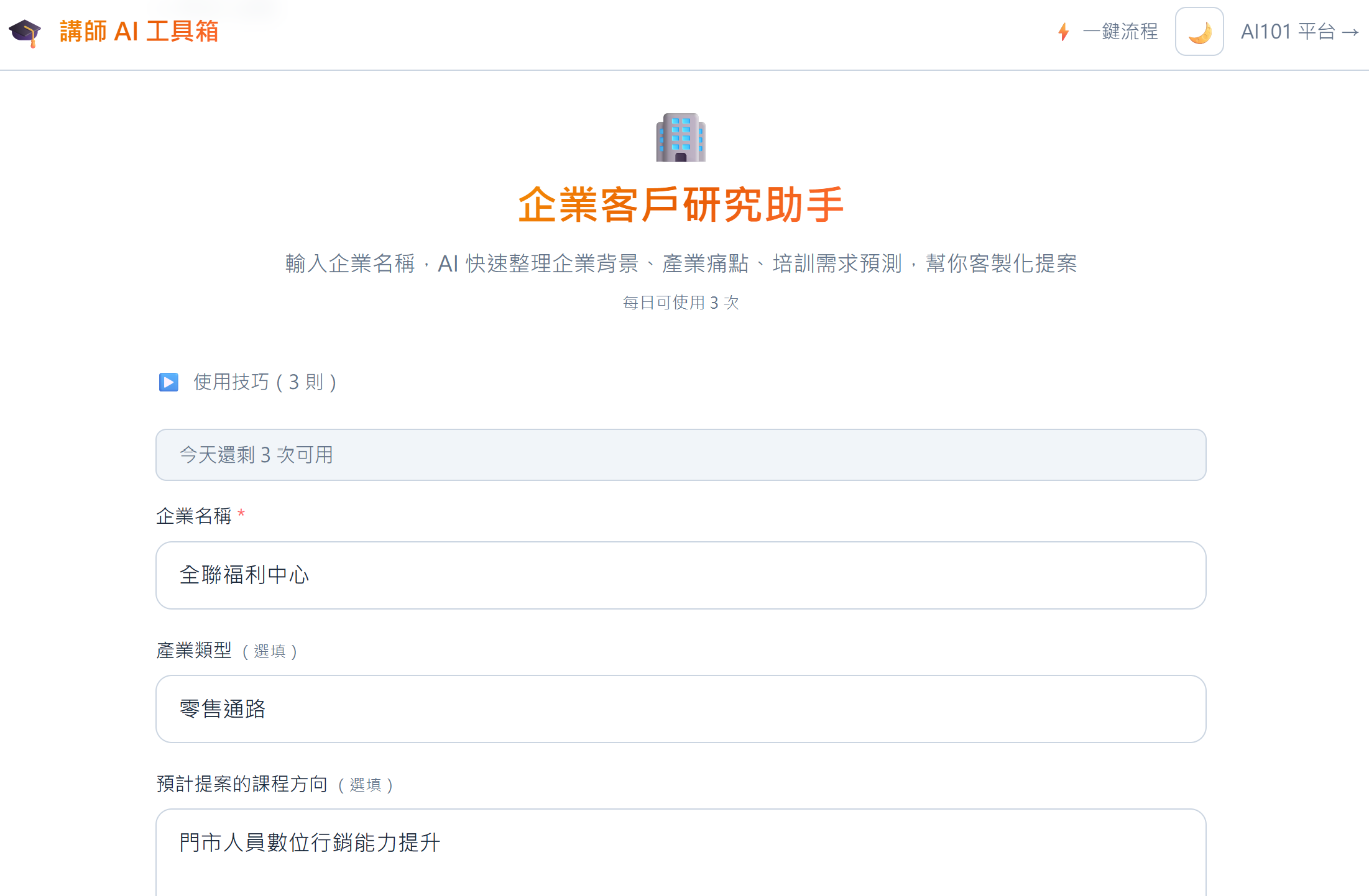 Google 搜到的資訊零散不結構化,這個工具直接整理成企業背景、痛點分析、培訓需求預測的格式,還會根據你的課程方向給客製化提案建議,省時又聚焦。