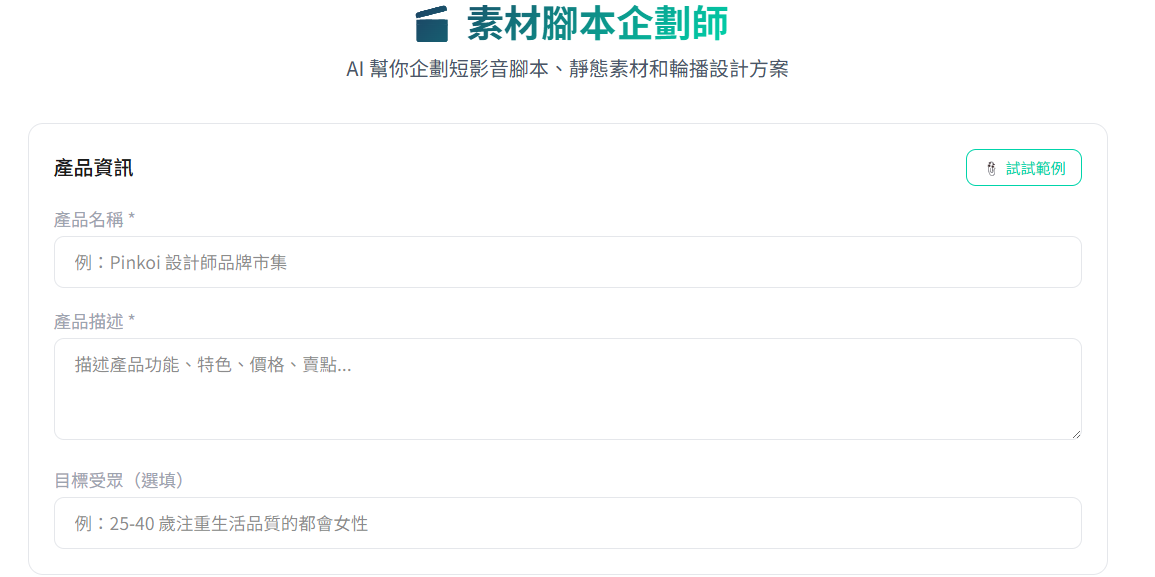 必填產品名稱和產品描述,選填目標受眾。然後選擇要產出的素材格式(短影音/靜態/輪播,可複選)和投放平台即可。