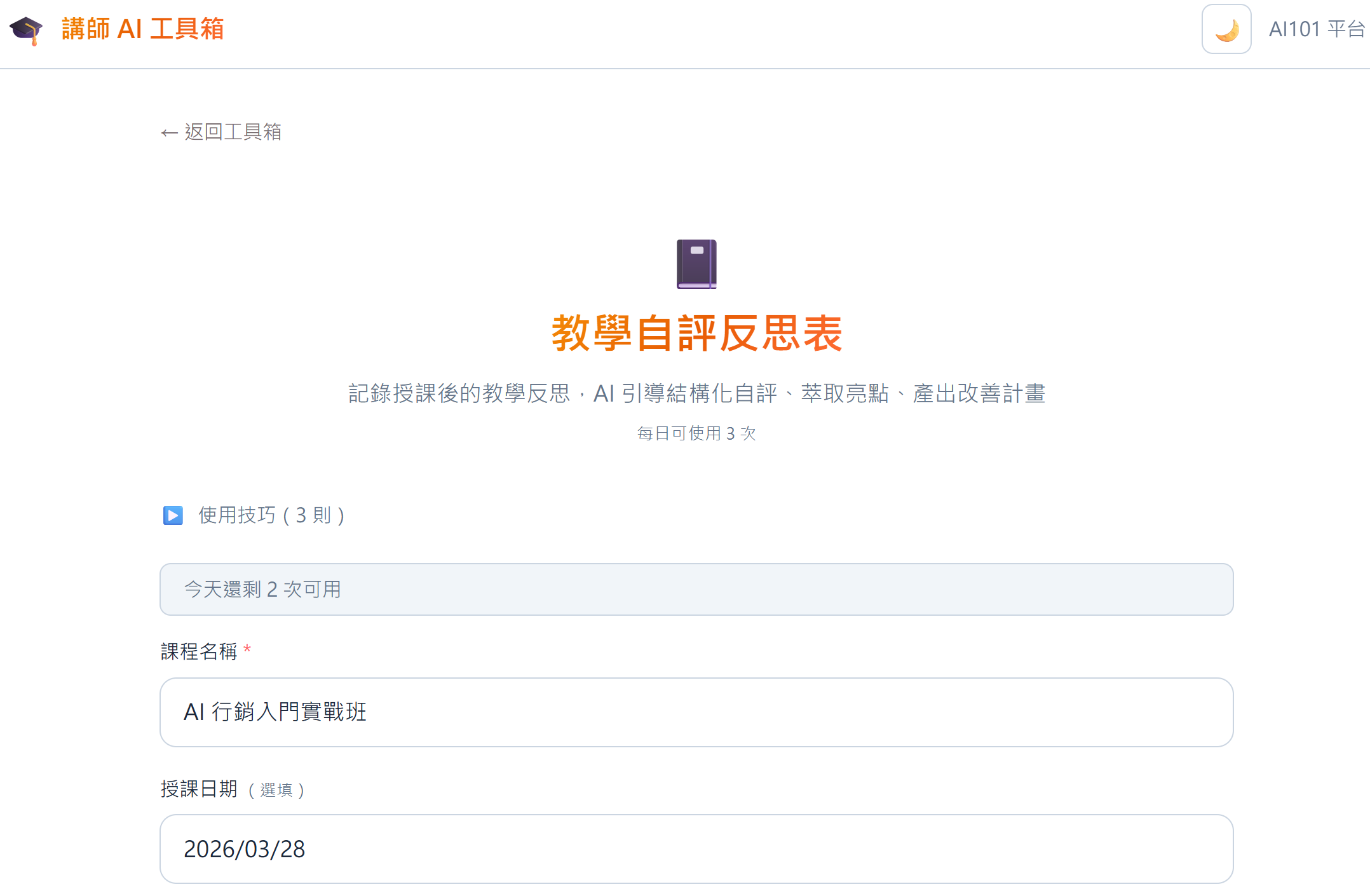 必填的只有課程名稱,其他都是選填:授課日期、做得好的地方、可改進的地方、學員反應回饋、下次想嘗試的改變。填越多 AI 分析越精準。