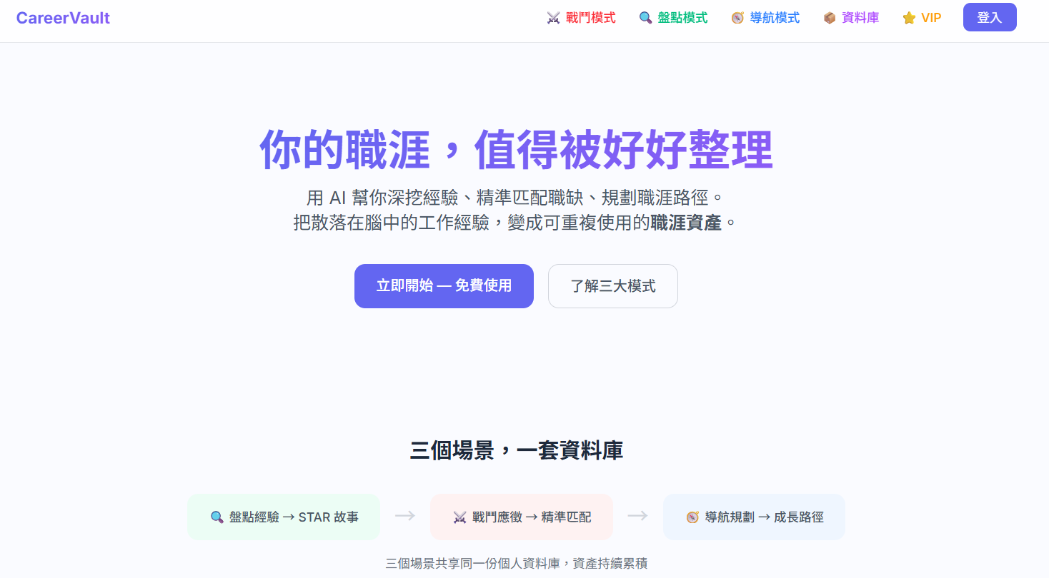 一般工具著重排版美化,CareerVault 著重內容深挖。透過 AI 對話引導你萃取工作經驗的價值,把平凡的工作描述轉化為 STAR 故事,並逐字比對職缺 JD 做 ATS 關鍵字匹配,還有完整的職涯規劃功能。