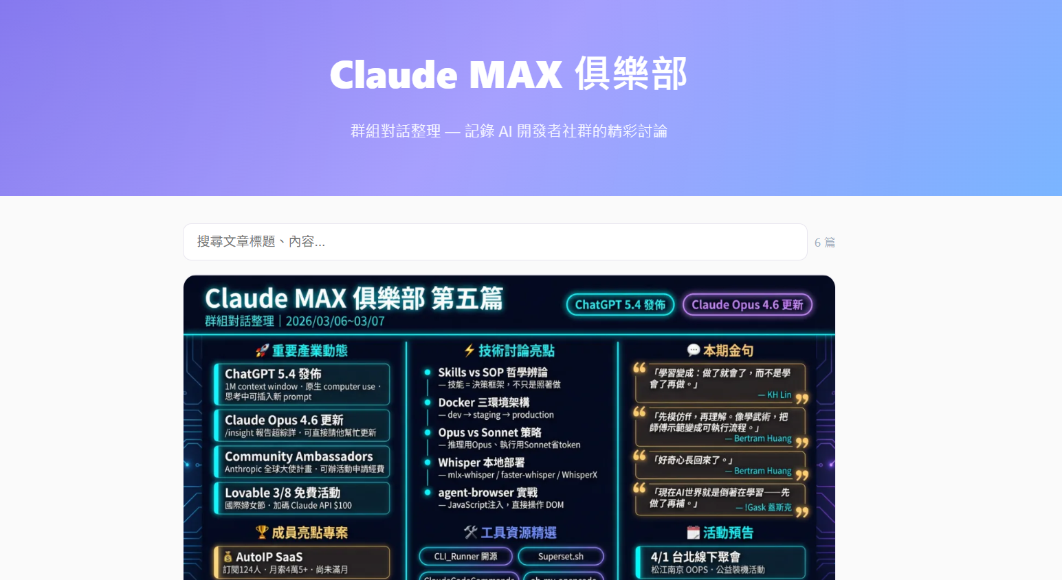 目前以 AI 開發者社群(Claude MAX 俱樂部)的對話為主,記錄專案分享、工作流程討論與精彩觀點。