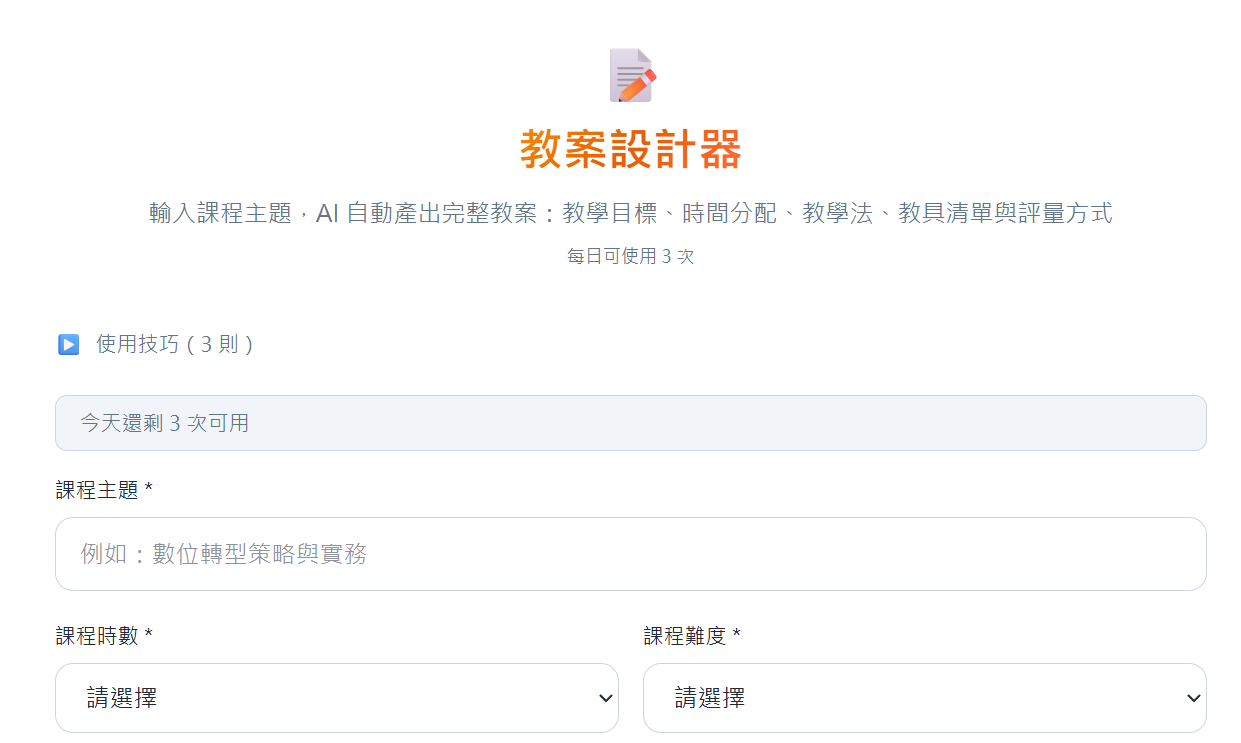 每天可免費使用 3 次,足夠一般備課需求。不需要註冊帳號,打開網頁就能直接使用。