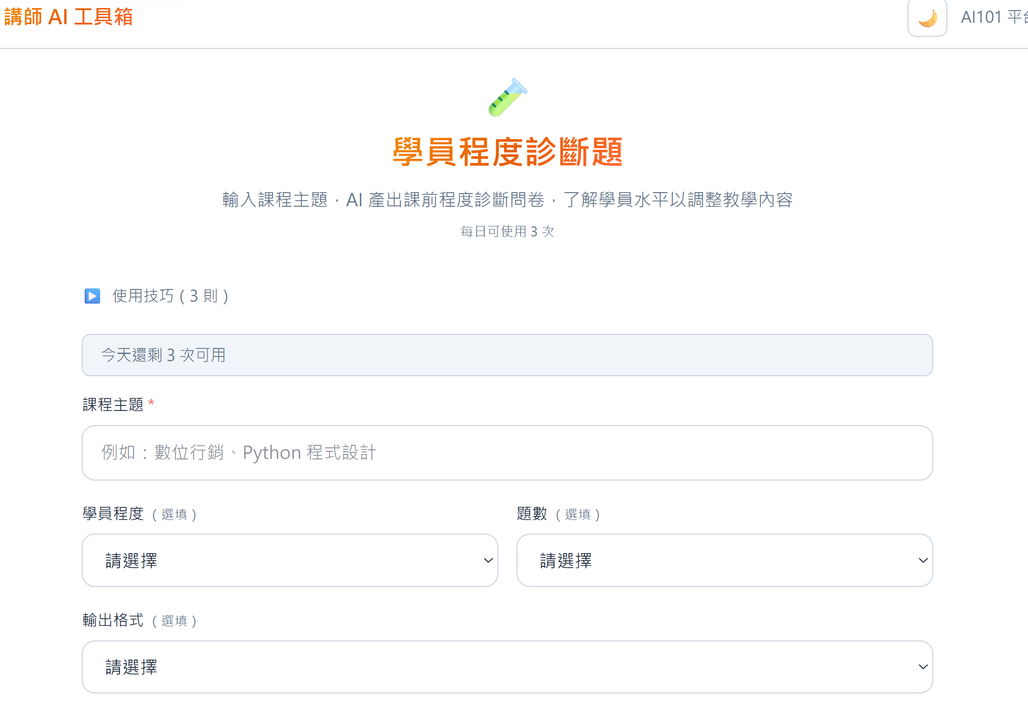 輸入課程主題,AI 自動產出對應領域的程度診斷問卷,不用自己想題目費半天