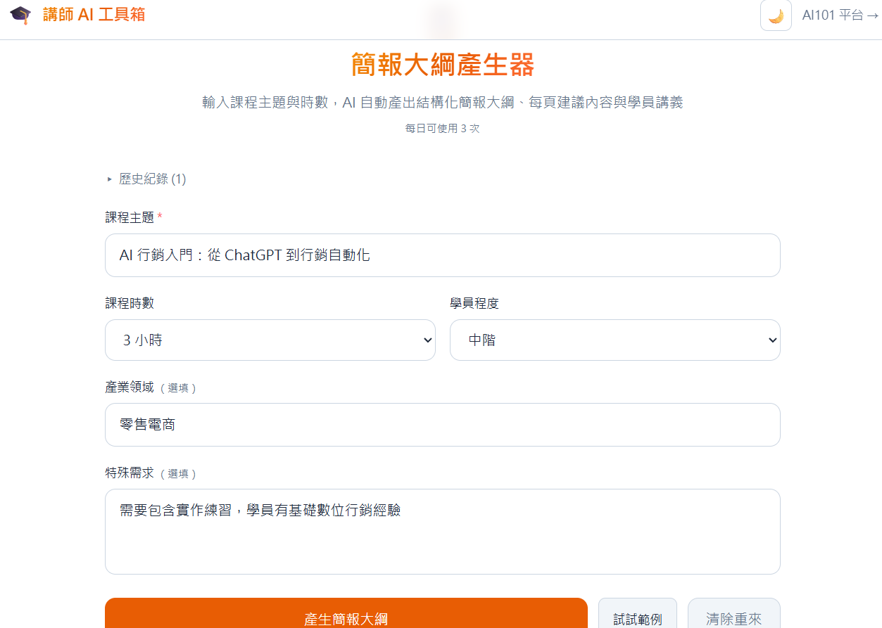 簡報大綱產生器每日可免費使用 3 次,足夠日常備課需求。其他工具的使用次數依各工具規定。
